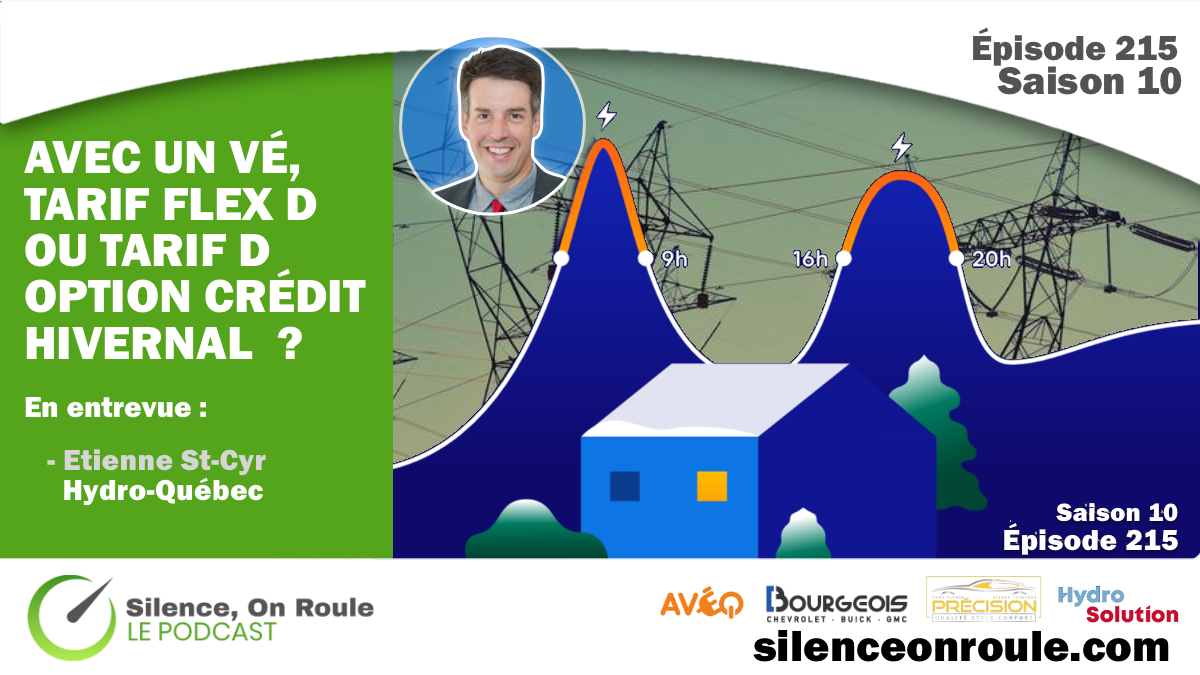 | Choisir son tarif électrique quand on a une voiture électrique | 60 min | Hydro-Québec offre le tarif D, le Flex D, le crédit hivernal, Hilo... Quels choix faire quand on a une voiture électrique ? |